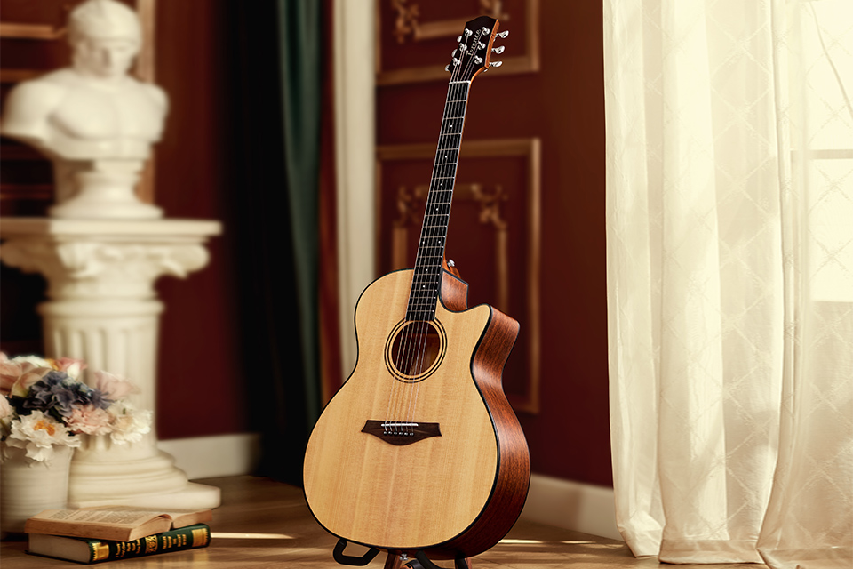 指板の素材は硬く、高強(qiáng)度?高硬度?高安定性を持ち、水分や濕気の影響を受けにくく、音の伝導(dǎo)性に優(yōu)れ、伝統(tǒng)的なドットインレイと組み合わせられています。 |